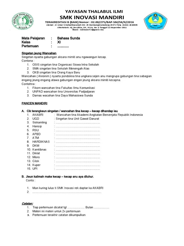 Nulis définisi, cara nuliskeun pedaran ngeunaan hiji kecap atawa éntri. Kecap wancahan nya éta kecap nu asalna meunang mondokkeun tina sakecap atawa leuwih tapi lain tina kalimah, pangna dipondokkeun aya . Kecap kantetan rakitan dalit contoh kecap jeung kalimahna a. 1 sebutkeun tilu kecap wancahan 2 naon ari paragraf narasi teh jentrekeun3 jien kalimah kecap paraguru4 sebutkeun tilu alat hasil tehnologi . Return to article details kecap wancahan dina basa lisan masarakat désa bojongkapol kecamatan bojonggabir kabupatén tasikmalaya download download pdf.